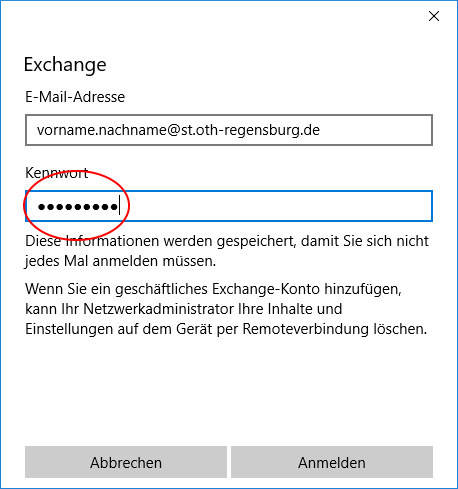 - Nach einem Klick auf „Anmelden“ werden Sie eventuell noch dazu aufgefordert, den vom Exchange-Server angeforderten Sicherheitsrichtlinien zu übernehmen.